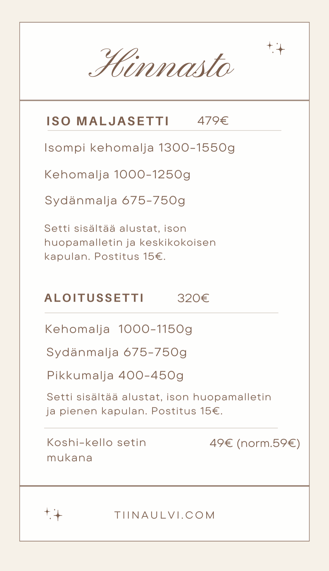 Settejä vain tilauksesta, yksittäisiä maljoja voit tiedustella sähköpostitse maljakauppa@gmail.com.